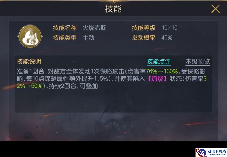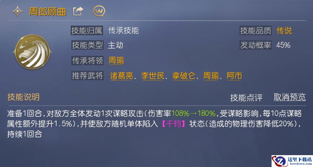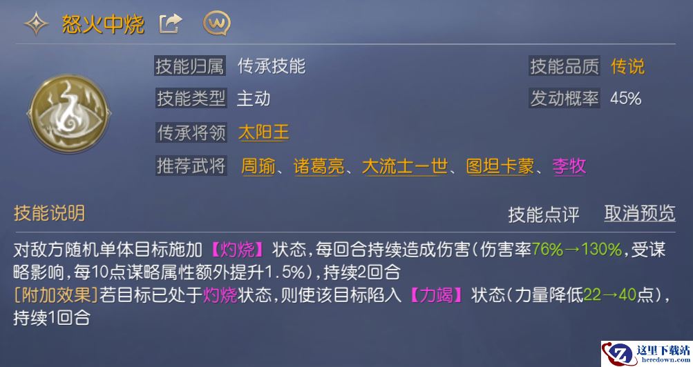 周瑜自带技能可造成全体【灼烧】,而【怒火中烧】可对已处于灼烧状态的敌人施加【力竭】,最高可降低40点力量值,配合自带技能可对物理队有一定克制能力,并且能提供不错的持续伤害。