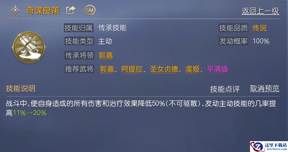 【郭嘉】作为辅助型将领,在队伍中的作用就是优化输出位的技能释放效率,所以二技能可以搭配上【奇谋良策】,能让自带技能的发动率达到100%,将容错率降至最低。