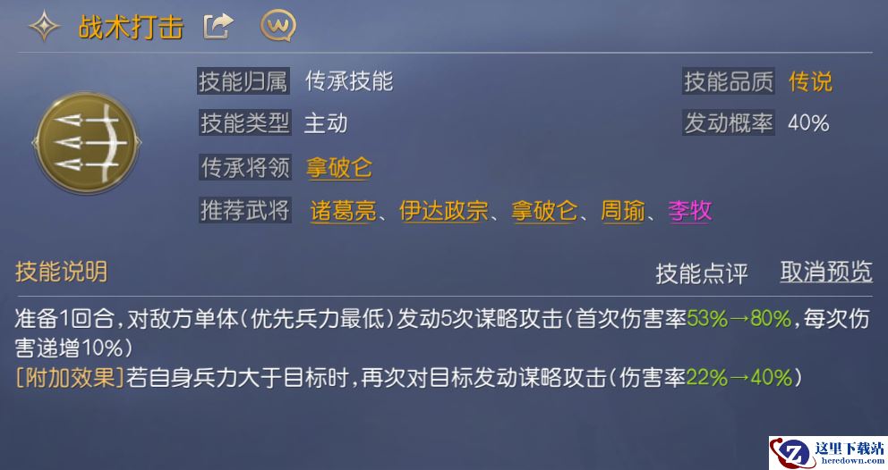 因为【诸葛连弩】可以靠郭嘉来优化发动效率,所以不用搭配智计百出,而是搭配一些补充输出能力的技能,如【战术打击】,该技能在发动后可造成5段谋略伤害,并根据兵力来判定额外伤害,配合诸葛连弩的多段伤害非常有效。