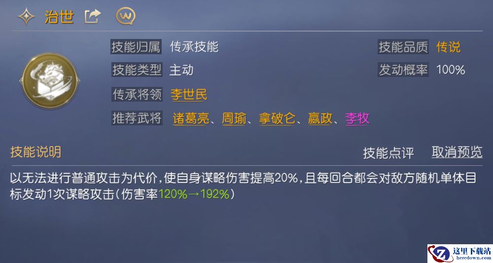 另一个技能推荐治世,该技能会让诸葛亮放弃普攻,转而获得每回合稳定的一次单体谋略输出,并能让自己所有谋略伤害提高20%,作为以主动技能攻击为主的诸葛亮并不需要普攻来触发技能,所以这个代价完全可以接受。