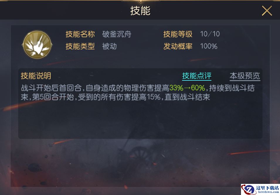 项羽的自带技能【破釜沉舟】,是一个百分百概率发动的被动技能,可以给自身一个伤害提升33%的增益效果,满级达到60%,该效果全程有效。但从第五个回合开始,项羽受到的所有伤害会提升15%,直到战斗结束。