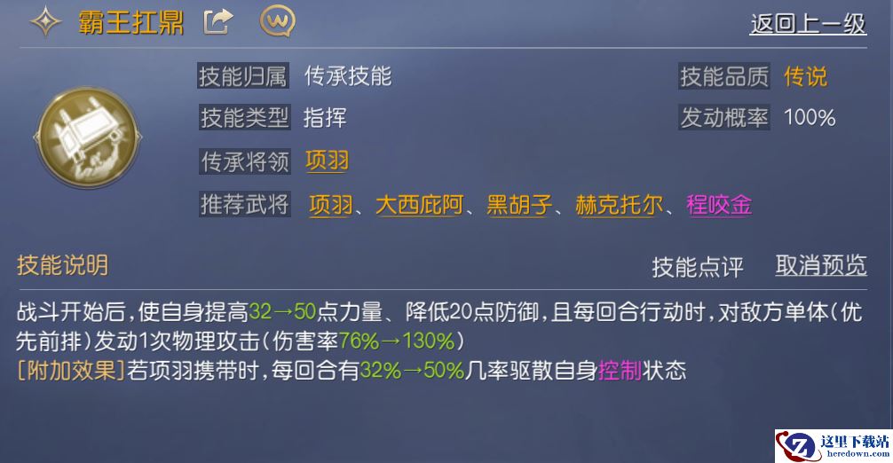 【霸王扛鼎】这个技能完美契合项羽,不仅有50的力量提升,每回合行动时都可发动1次物理攻击,最重要的是每回合都有概率驱散【控制】效果,极大的提升了项羽的输出效率,虽然会降低自己20点防御,但性价比非常高。