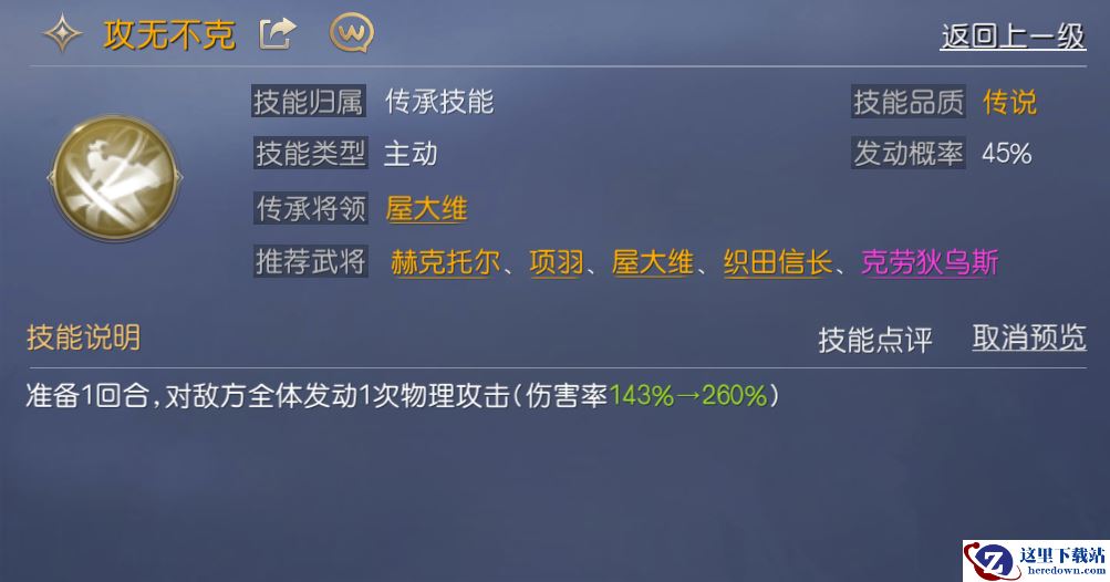 【攻无不克】没有额外效果,但发动后可造成260%的全体伤害,配合上项羽高额的力量属性与物伤加成,最终的实际伤害会远远超过这个数值,用于爆发最好不过。