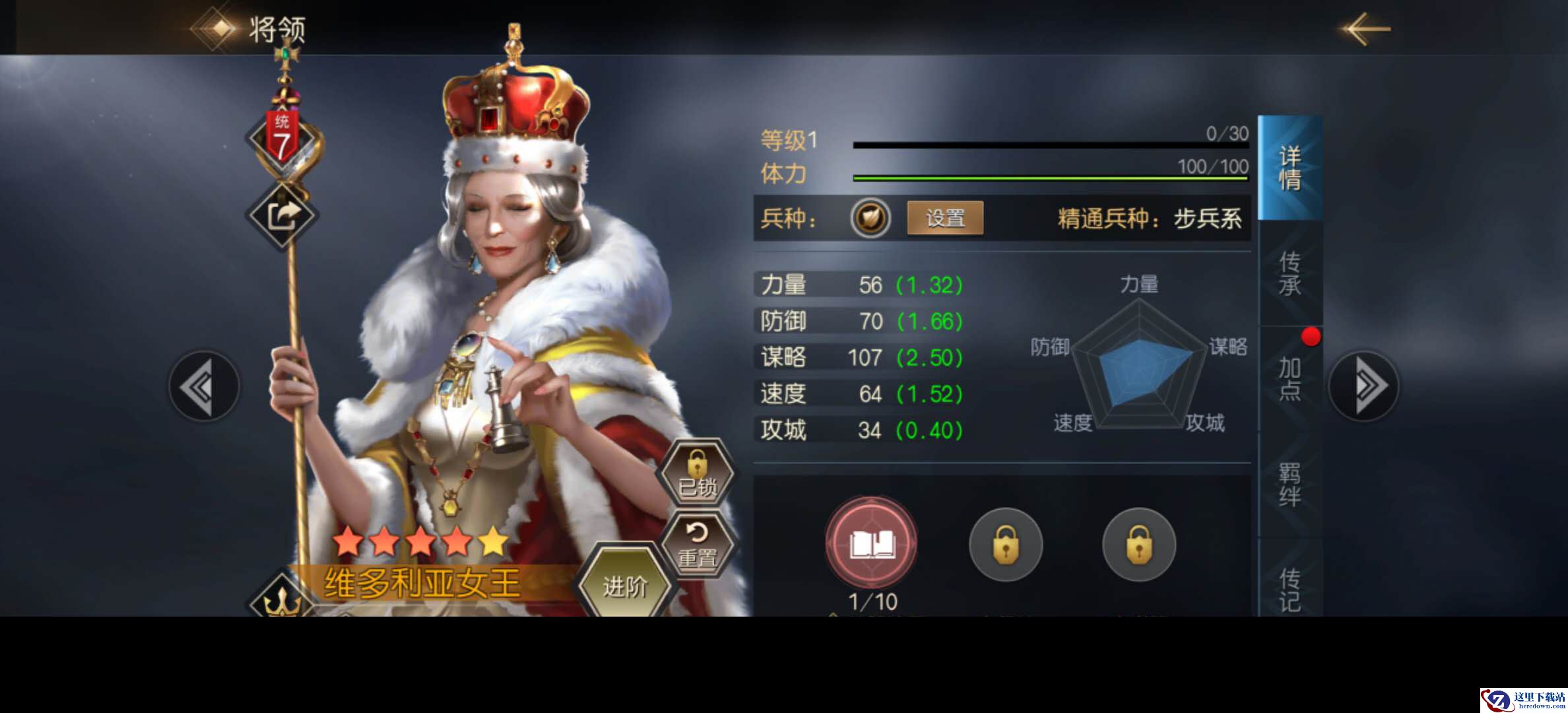在游戏中,除了有力量属性超群的物理输出型将领外,还有谋略属性主导的谋略输出型将领,二者均为队伍中的输出主力军。下面给大家带来西洋阵营中的5星将领维多利亚女王的全面分析。