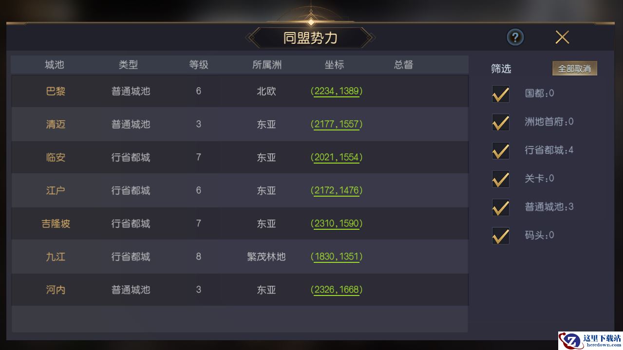 同盟势力是同盟实力的体现,可以通过攻占城池来提升,攻占的类型包括码头、普通城池、关卡、行省都城、洲地首府以及国都。