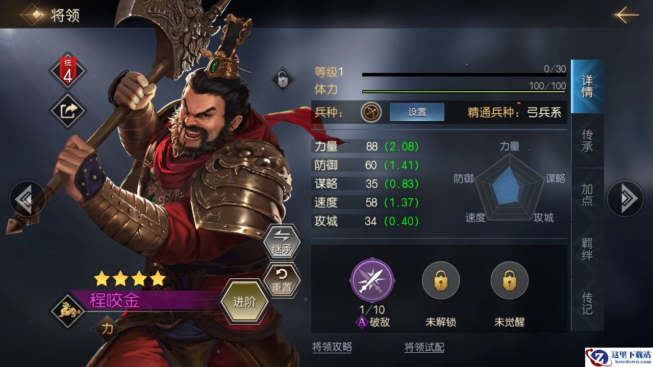 程咬金拥有着队伍内最高的速度成长,所以其在物理输出的同时,还可以作为队伍中的先手,给敌人加上defuff,让队友更好的打出额外输出,因此我推荐带【突袭】+【啖睛威慑】,这样能先手让对面受到的伤害提高,同时【缴械】效果也能对我方将领起到保护作用。