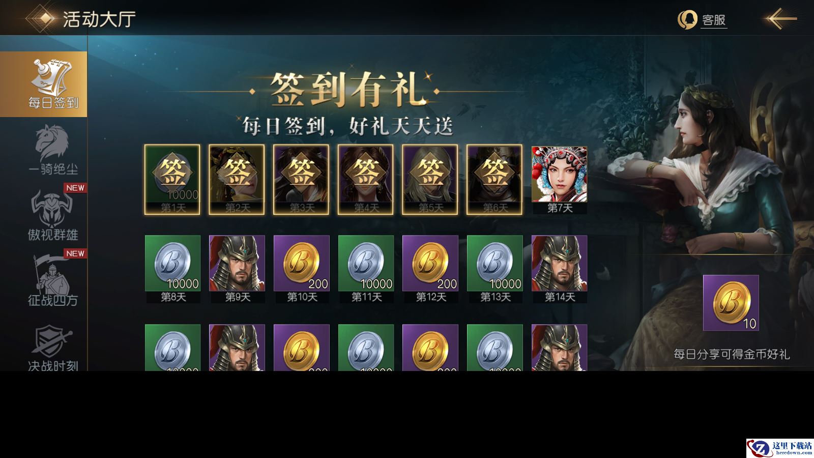 银币、金币赠送,连续签到还有5星级将领赠送,每日进行分享还可以获得10金币,小伙伴们千万不要忘了每日签到哦。