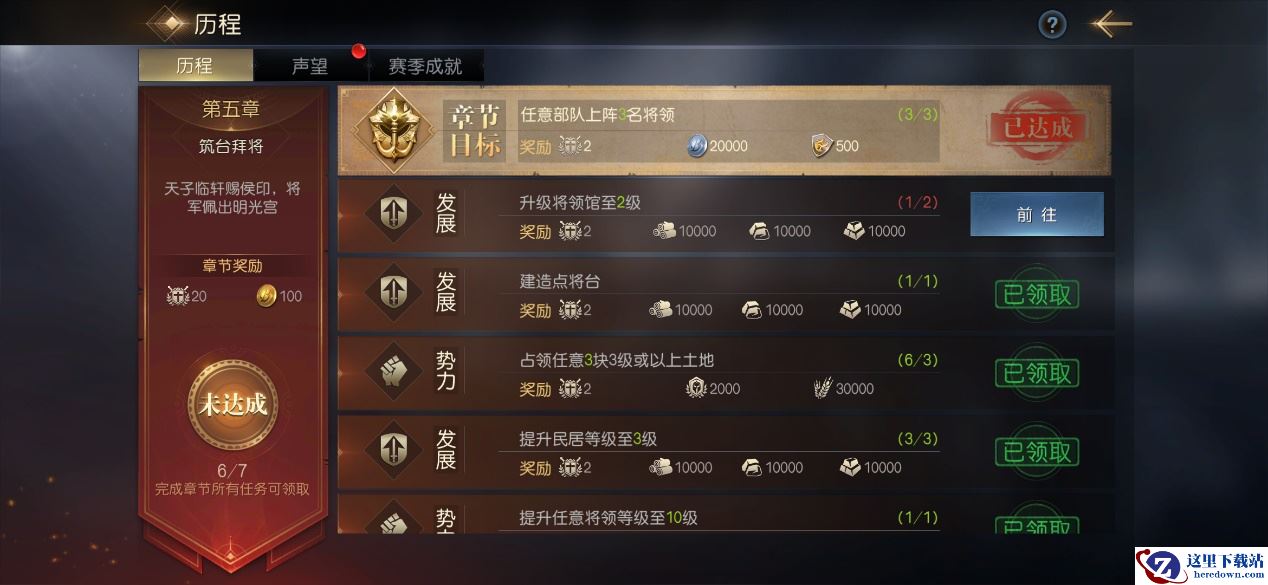 【历程】任务。在主界面的【历程】系统中,有很多基础任务,例如攻占一定数量的土地,升级资源建筑,提升将领等级等等。只要完成这些任务,就能获得相应奖励,并且开启下一个新章节的任务。章节的等级是【内政厅】的升级条件,所以想要提升【内政厅】的等级,解锁更多其他的资源建筑,每日就尽量按照历程的章节任务来吧。