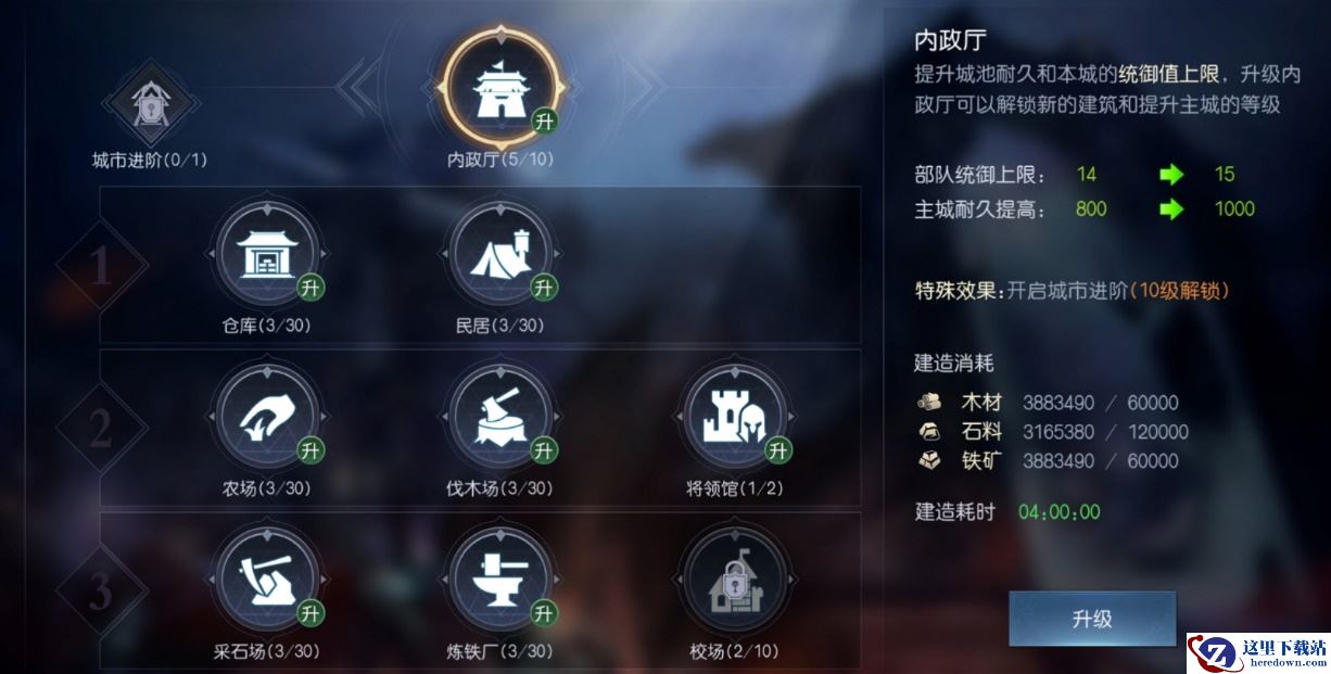 1、 升级城建。小伙伴们在进行前期城建时应当以资源类建筑为主,升级【采石场】提供石料资源;升级【炼铁厂】提供铁矿资源;升级【伐木场】提供木材资源。这三类资源在游戏中非常重要,任何建筑的升级都离不开这三个资源,只有基础资源囤积足了,才更好地进行其他建筑的升级。