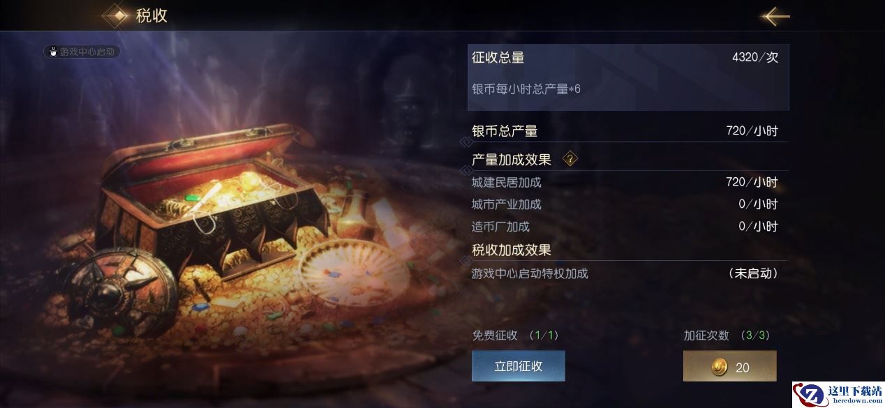 2、 税收征收。小伙伴们可以在【税收】系统中获得大量的银币,每天都可以免费征收1次,每次还可以花20金币再额外加征3次。银币的总量还受到民居、产业以及造币厂的加成效果,所以建议小伙伴们在加成效果最大化后再去征收税收,这样银币的收益可以达到最大化。