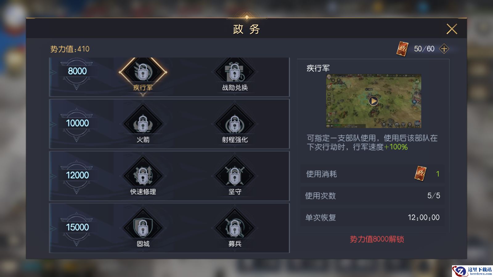 政令是政务玩法的基础物资,在政务系统中我们可以进行多种政务行动,比如恢复部队体力,在资源地建立营田所,行军途中强征当地粮草等等行动,是游戏中沙盘玩法里最重要的货币。