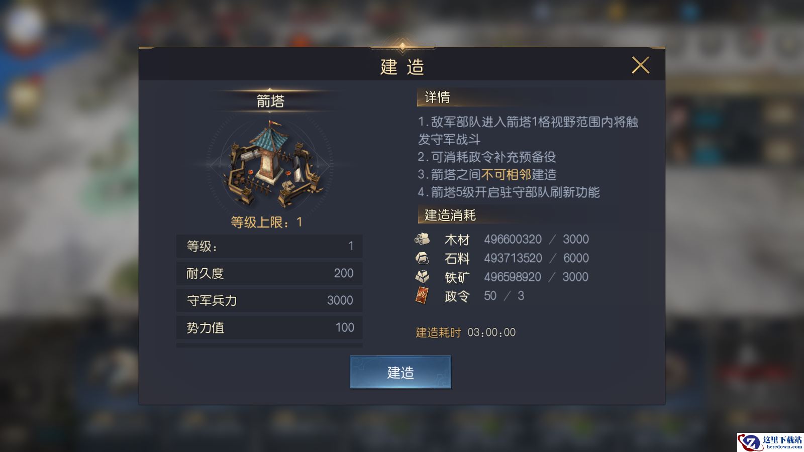 木材、石料、铁矿是游戏中最核心的三种建筑资源,可以用于进行城市建设和部队器械升级,通过对不同功能的建筑进行建造和升级,提升各种资源的产出,同时解锁一些新的建筑,使用新的功能。