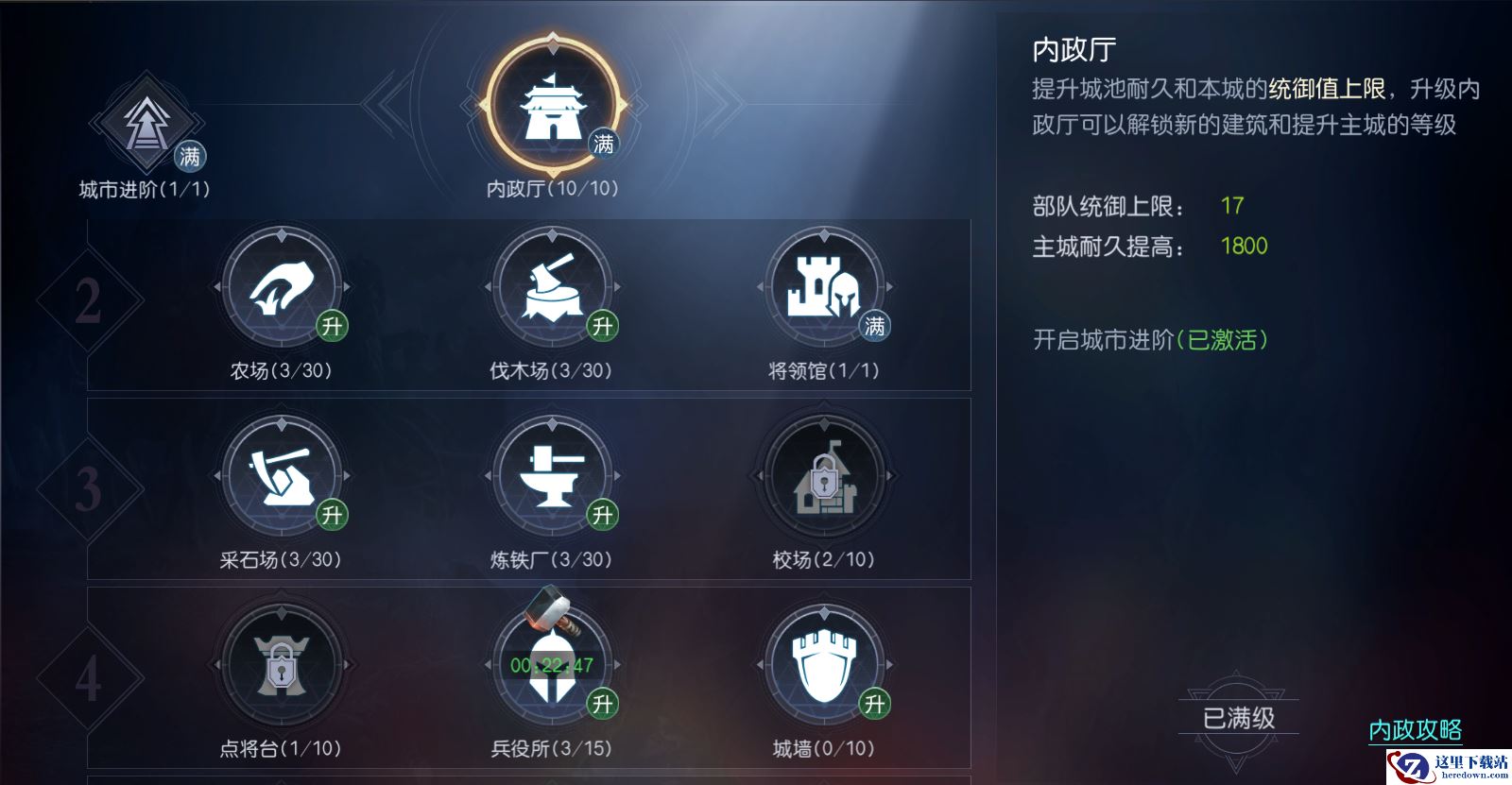 内政厅7级后就不用太着急升级内政厅,除非心仪的满编队因统御限制无法上阵,那么可以升到8级解锁统御厅。9、10级建筑中只有兵科学院与文明兵种有实用性,建议达到8级内政厅即可,到后期资源充足再考虑升级。