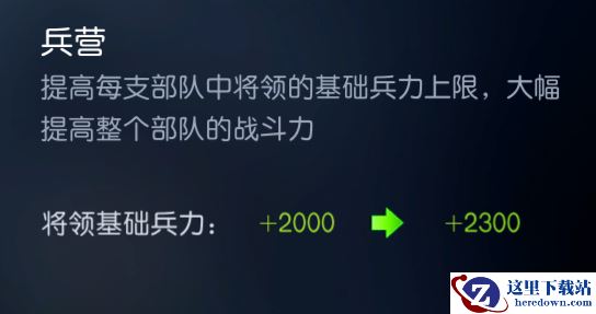 前期城建以内政厅7级为首要目标,7级后可解锁兵营,该建筑可直接提升将领的基础兵力上限,可让将领拥有更强的基础战斗力,能从多个方面减轻我们的压力,1是可让低等级将领直接在野地进行扫荡,极大的减少了练级时的频繁操作,2是达标高级地要求,从6级地开始,野地兵力都是超过等级标准的,升级兵营比练级、抽卡都更快更有效,可更快的开荒高级野地。
