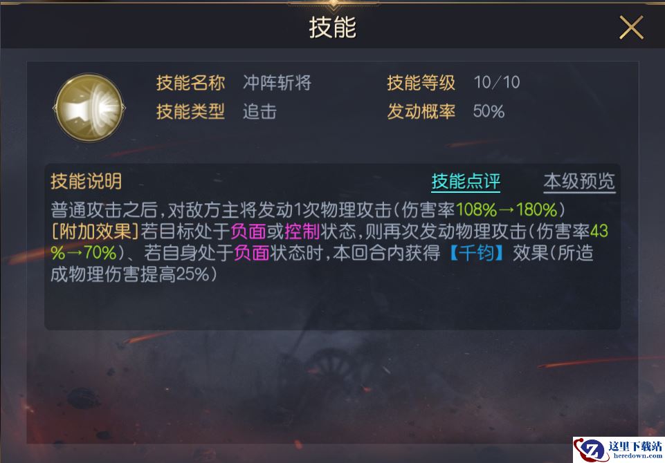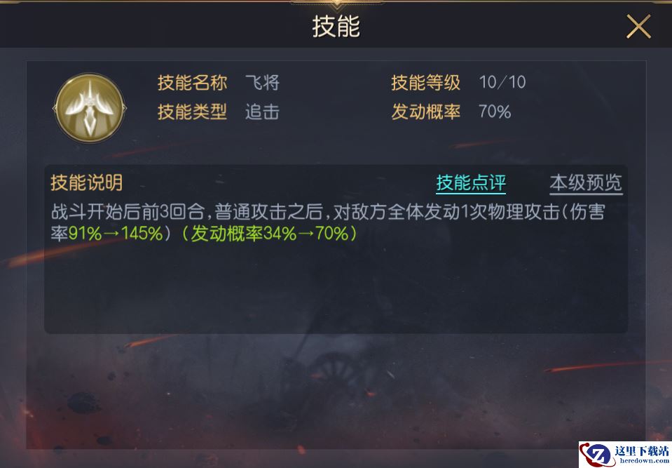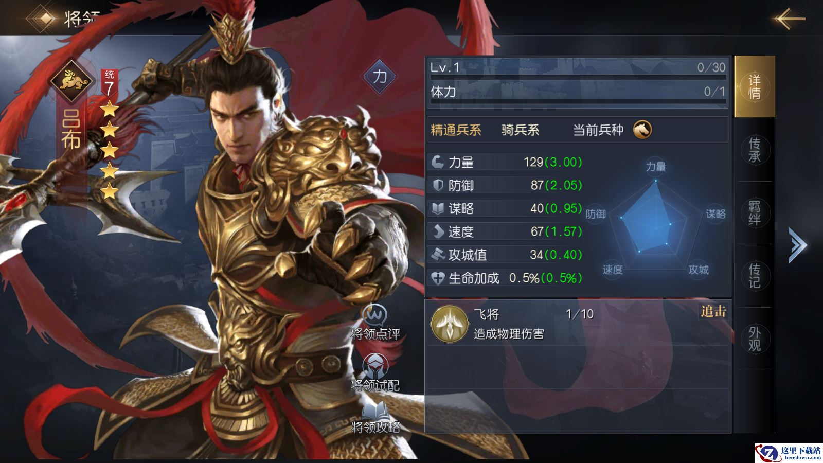 吕布一直是游戏中的武力担当,其追击技能【飞将】可在进行普通攻击之后触发额外伤害,可以针对敌方全体发动1次物理攻击,升至满级之后的AOE伤害非常高,发动几率也高达70%,是一个高伤且稳定的AOE输出技能。