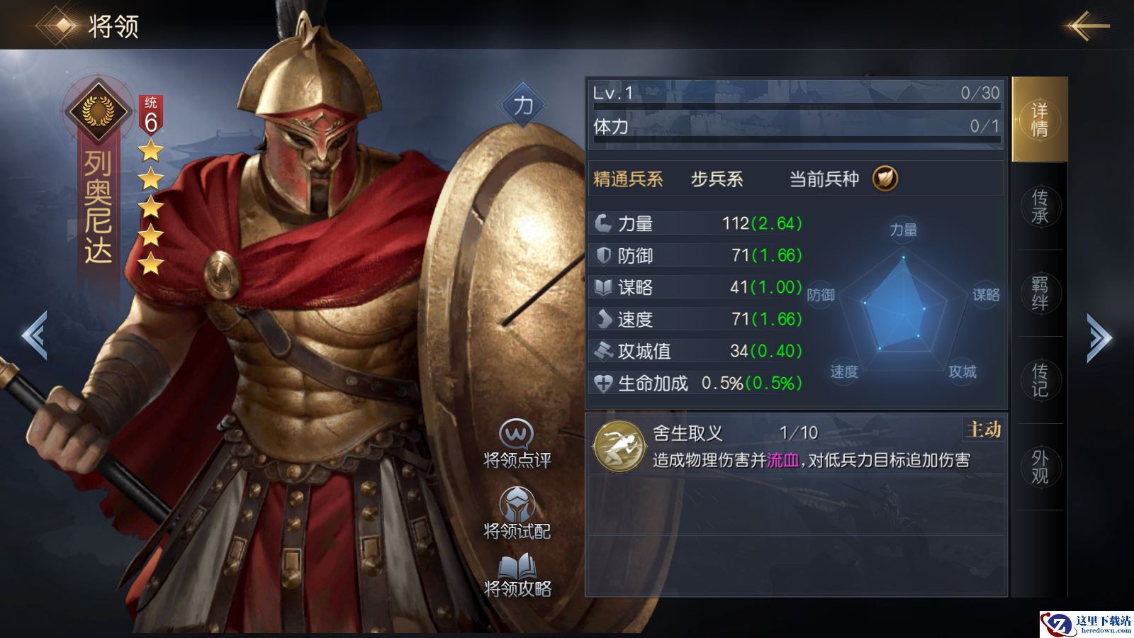 列奥尼达也拥有不错的力量属性,虽然其自带技能即时伤害仅有150%,但附加【流血】状态后能造成2回合的持续伤害。最强势的是【舍生取义】的附加效果:对兵力低于50%的目标,造成双倍伤害。通过这个效果,列奥尼达能搭配上爆发力优秀的将领,快速将敌人兵力压低,然后进行倍伤输出。