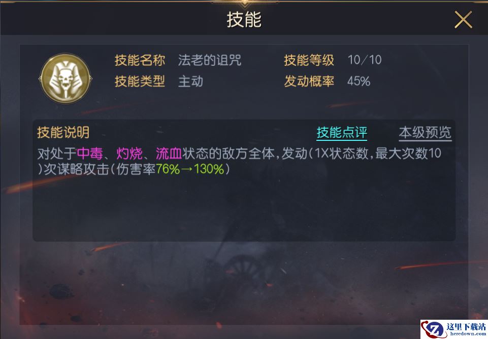 胡夫是一个比较另类的输出C位,【法老的诅咒】是通过敌方所处的中毒、灼烧、流血状态的状态数目,从而对敌方全体发动对应次数的谋略攻击,理想情况下能造成高达1300%。所以胡夫想发挥该技能的实际效果,就需要搭配一些能造成这三类负面状态的技能或是队友。