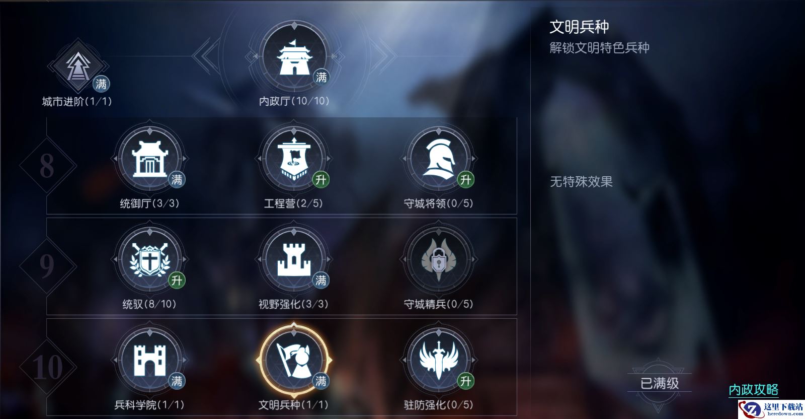 兵种又分为两大类别:基础兵种和文明史诗兵种。只有三星级以上的将领才能更换兵种,也需要将领的等级达到30级才能够学习新兵种,其中文明兵种需解锁后才能学习,本文吗的兵种只需达到内政厅10级进行解锁后。其他文明兵种需达到条件,并消耗对应的五星将领进行解锁。