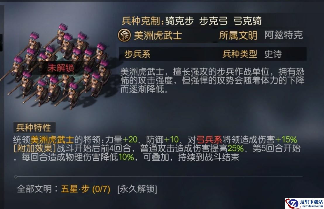 2、【美洲虎武士】,适合搭配普攻流将领,增强其力量属性以及普攻伤害值,比较适合快速战斗,在战斗前期拥有恐怖的攻击强度,但是其攻势会随着游戏的进行而逐渐降低。