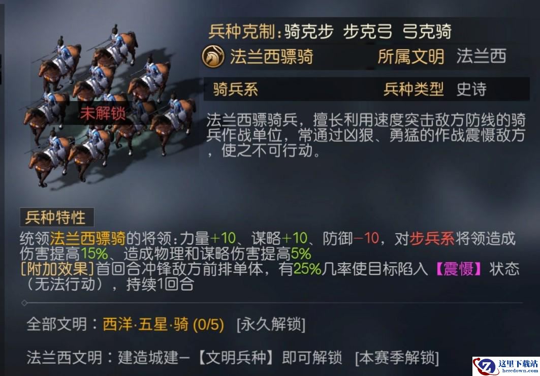 2、【法兰西骠骑】,利用高额的速度突击敌方防线,首回合可以对敌方前排发动冲锋,有几率震慑控制敌方1回合,使其无法行动。