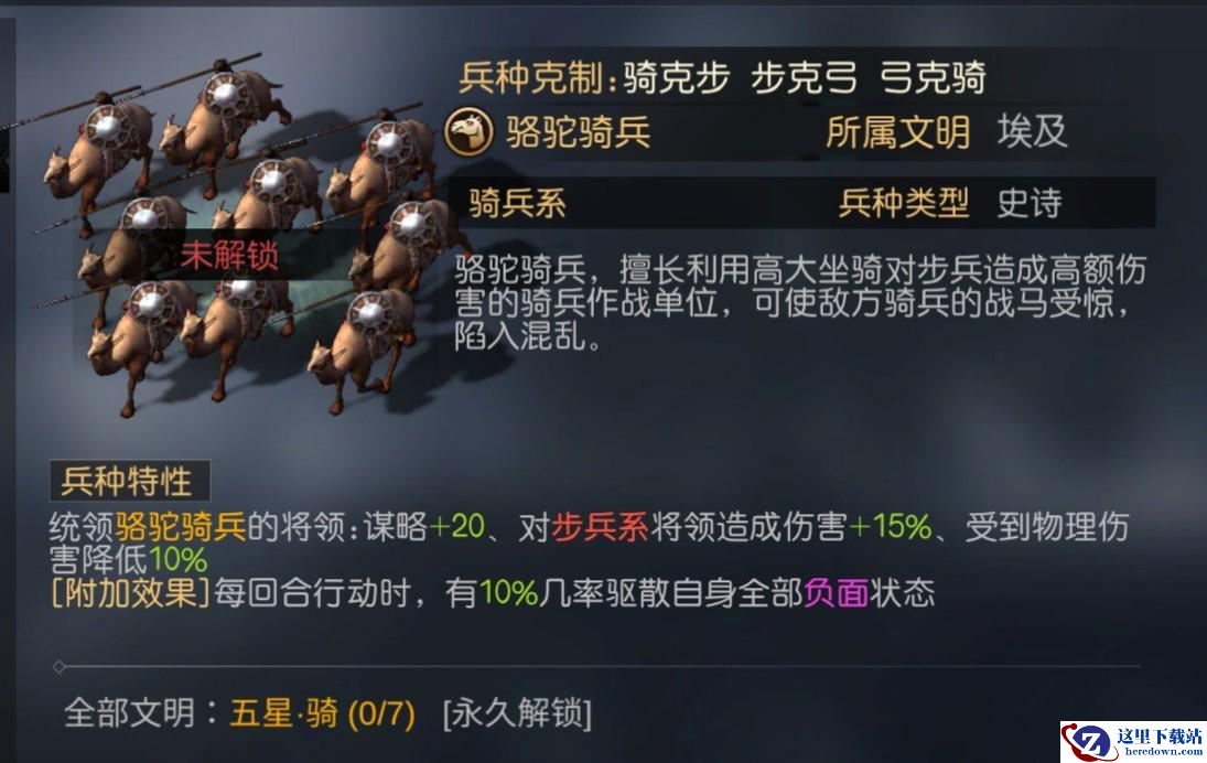 3、【骆驼骑兵】,非常适合谋略输出阵容,提升了谋略属性,还提高了其物理防御能力,每回合都有10%的几率驱散自身全部负面状态,非常适合对抗负面控制流阵容。