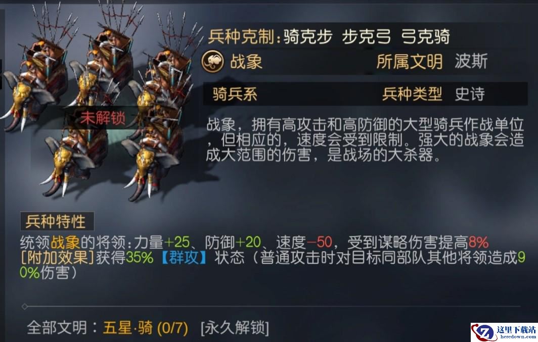 4、【战象】,拥有高攻击和高防御能力,虽然速度受到一点轻微的限制,但是有大几率可以获得群攻状态,普通攻击就可造成大量的AOE伤害。