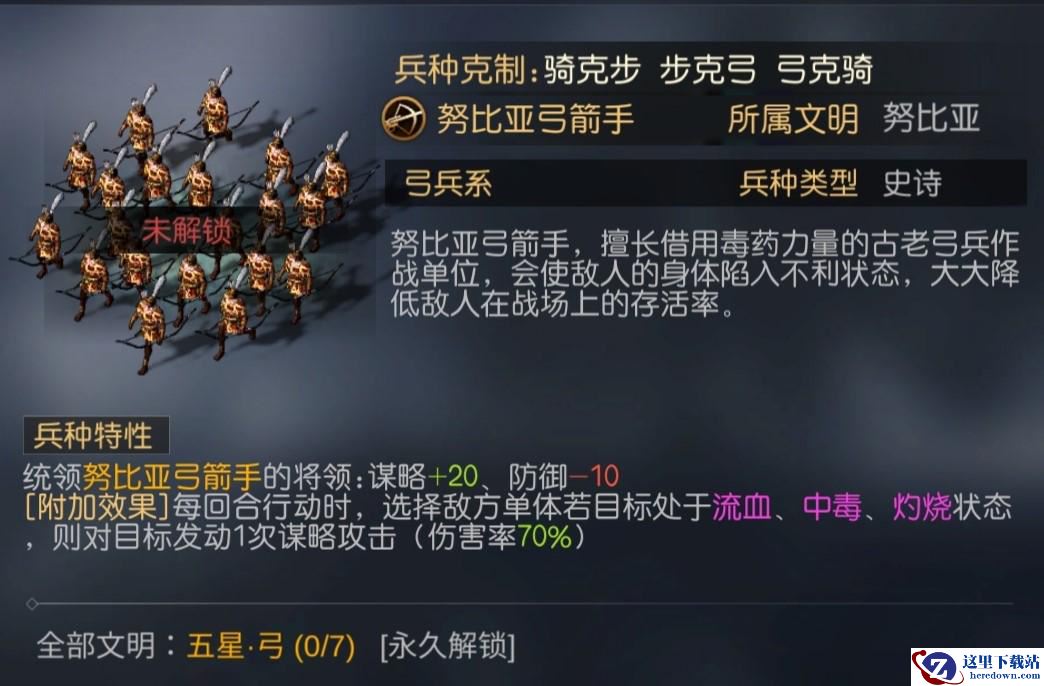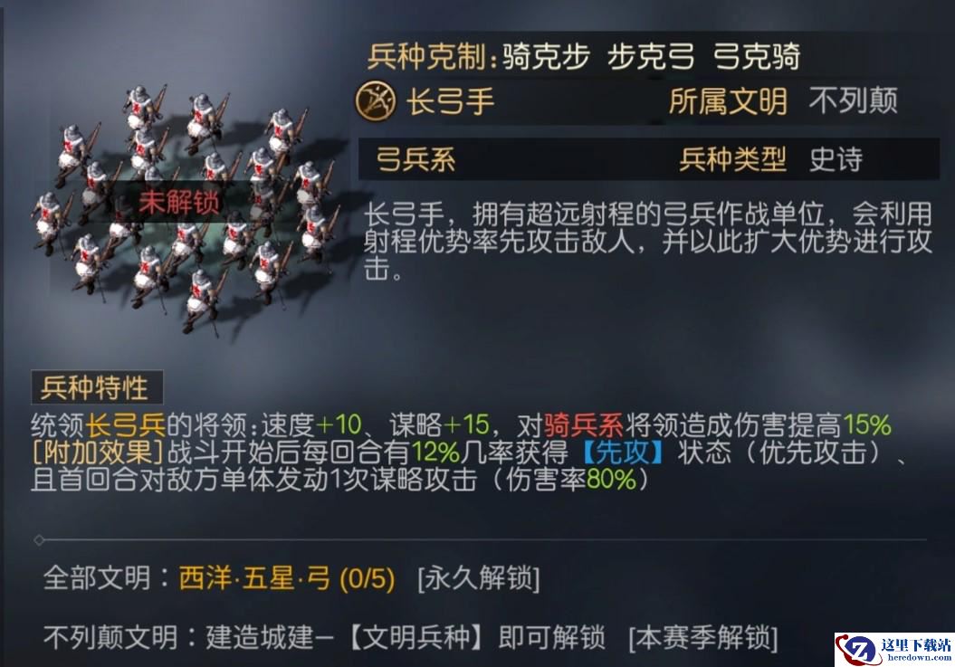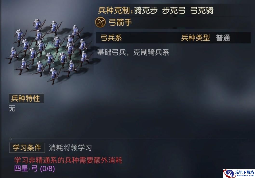 1、【弓箭手】,属于普通的兵种,能克制骑兵系,没有特性。