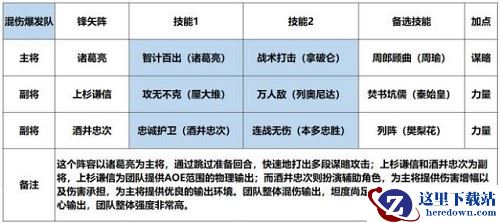 以诸葛亮为主将有物理输出还有多段谋略攻击,副将提供AOE范围物理输出和辅助伤害承担效果,整体为诸葛亮提供更好的输出空间,整体强度非常高。
