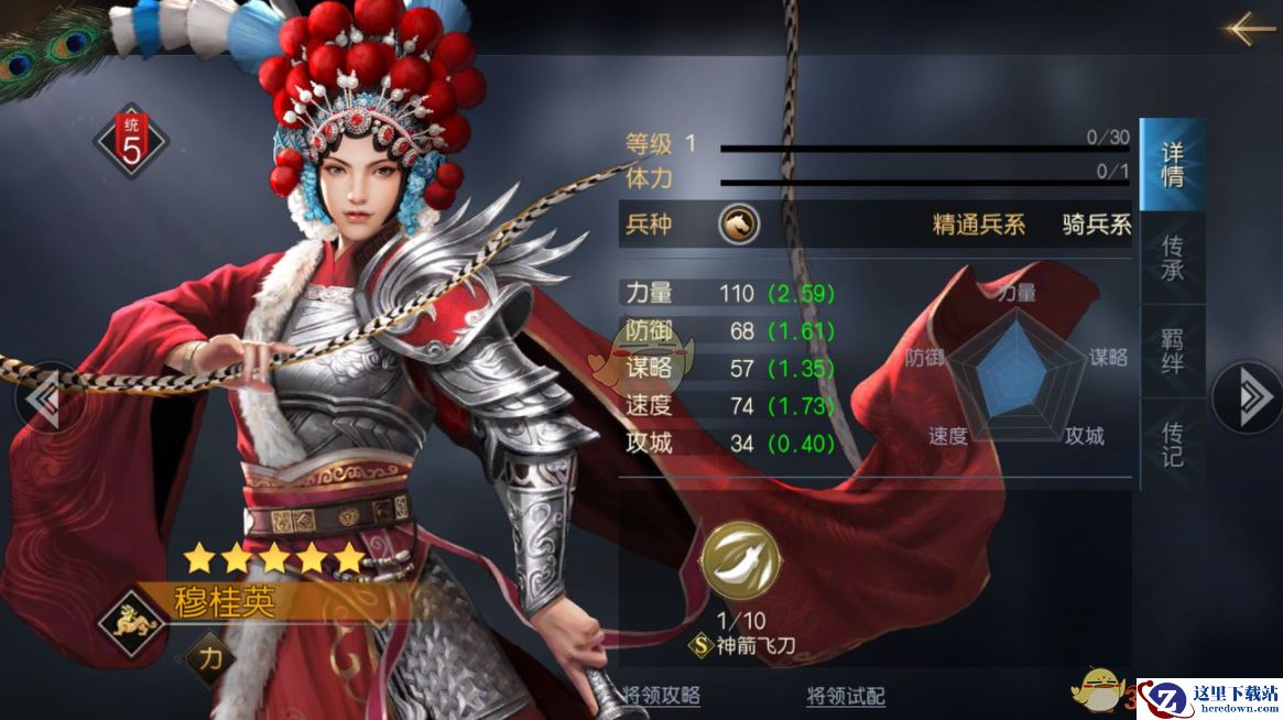 穆桂英作为骑兵系的一员,具体属性为:力量110(2.59)、防御68(1.61)、谋略57(1.35)、速度74(1.73)、攻城34(0.4)。可以看出,穆桂英是一位力量型的物理攻击将领,这里推荐小伙伴们加点时主加力量,其次考虑防御和速度。