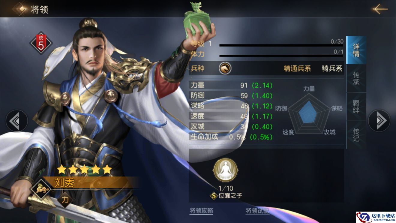 刘秀作为一个力量型输出将领,他的力量属性比较高,五维属性除了防御和速度略高之外,其技能不仅能造成不错的基础伤害,还可对带【负面】状态的敌人再次造成额外伤害,非常适合在buff队中担任输出。