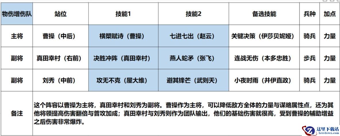 在阵容搭配时,推荐【曹操+真田幸村+刘秀】。这个阵容以曹操为主将,真田幸村和刘秀为副将。曹操作为主将,可以降低敌方全体的力量与谋略属性点,还为其他将领提高伤害翻倍与普攻加成;真田幸村与刘秀则作为团队输出,他们的基础伤害就很高,受到曹操的辅助增益之后伤害非常爆炸。
