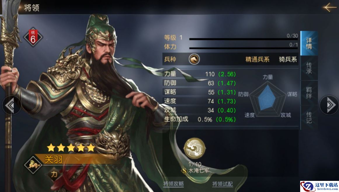 从关羽的五维基本属性中可以看出,其力量和速度属性较为出色,基础属性值和相应的成长率均较高,尤其是速度属性达到了同级别的前列,较高的出手速度使得关羽在战斗中能够先手压低敌人兵力和施加控制效果,非常适合作为核心输出或控制将领培养。