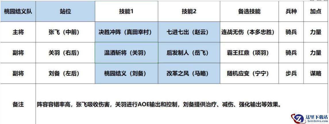 此阵容容错率较高,三名将领分工明确,张飞在前排依靠技能【嘲讽】敌人,为队伍吸收伤害,并且能够为敌人施加【震慑】状态,提高关羽的爆发能力;关羽作为主力输出,依靠技能进行AOE输出和控制。刘备则负责为己方将领提供兵力恢复、减伤、强化输出等效果,进一步提升队伍续航能力和输出水平。