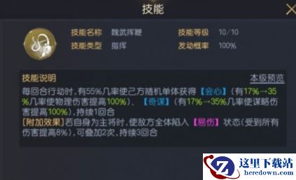 这是一个发动几率为55%的主动型技能,技能效果为:驱散敌方单体全部增益状态,并使其受到的物理伤害提升16%(满级提升25%),持续2回合。
