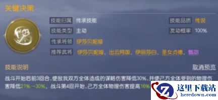 曹操的2技能则可以搭配技能【关键决策】,这是一个全面型的辅助技能。在战斗开始前3回合,降低敌我双方造成的谋略伤害并使我方全体受到的物理伤害降低,由于我方为物攻阵容,降低谋略输出毫无影响,但是若敌方是以谋略伤害为主的阵容,则形成了非常好的克制效果,大大限制了敌方的输出能力。同时【关键决策】从第四回合起会提升我方全体造成的物理伤害。