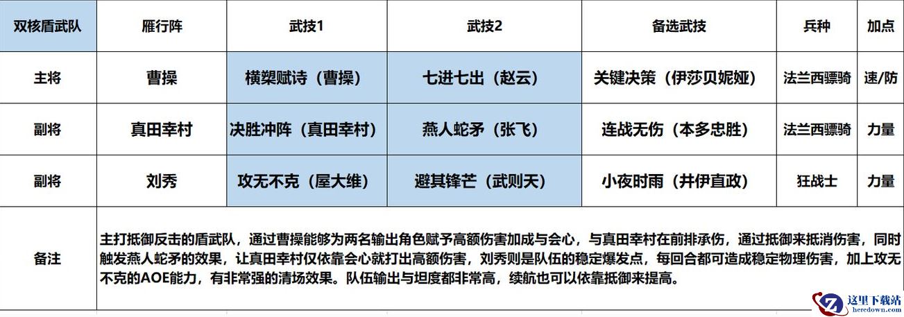 在阵容搭配时,推荐【曹操+真田幸村+刘秀】。这个阵容以曹操为主将,可以触发技能的主将效果,每回合都有几率使敌方陷入【易伤】,主要为团队提供增益状态以及伤害承受,真田幸村可同时担任输出与前排的效果,依靠抵御能够获得非常不错的承伤能力,在前四回合让刘秀稳定叠加技能释放次数,四回合之后依靠曹操高额的物理加成,让刘秀依靠兵种特性与技能效果打出成吨AOE,队伍爆发与持续伤害都比较稳定,坦度也很高。