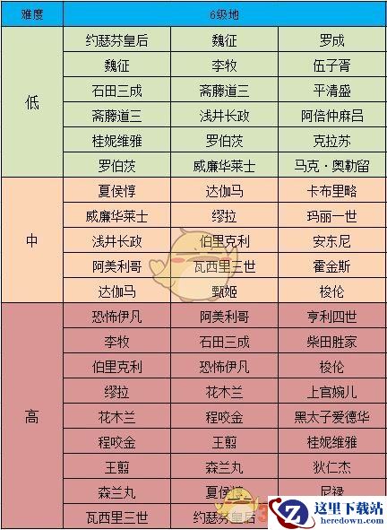 在看难度表之前,我还要提醒大家一个小技巧,就是要学会根据侦查的信息选择不同的队伍去攻略土地,比如我们侦查到了一个土地的守军大都为物理攻击型将领,那么选择一支高防御属性的队伍就能够加大胜率减小兵损,如果对方是谋略属性极低的弱智队,那么我们就可以选择高谋略的队伍速战速决。