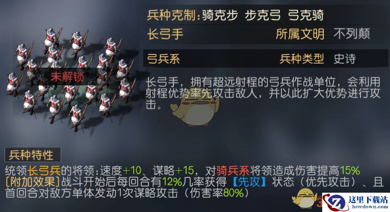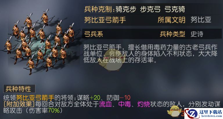 游戏之中目前为止开放的兵种并不多,综合考虑下来最契合这个阵容搭配思路的兵种就是努比亚弓箭手,属性上增加20谋略,还有每回合对处于负面状态的敌人发动谋略伤害的特殊效果。