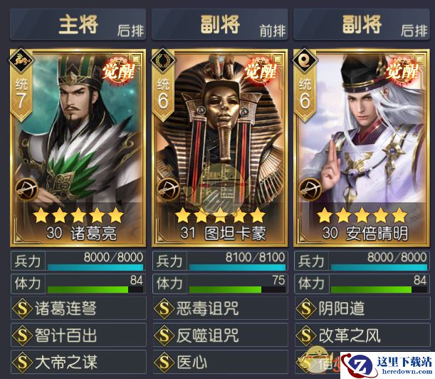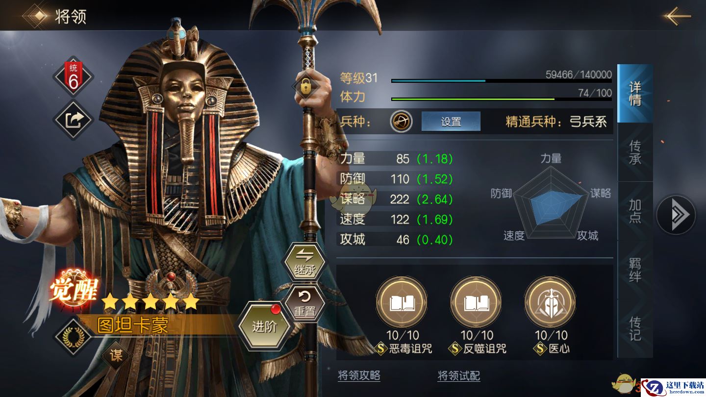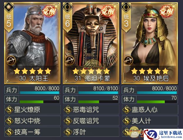 在将领之中图坦卡蒙是这个思路中相当核心的一个将领,虽然本身的属性不是非常出色,但是自带技能恶毒诅咒搭配他的传承技能反噬诅咒,可以完美地对敌人施加流血、中毒以及灼烧三种DEBUFF,持续稳定而且十分可靠。