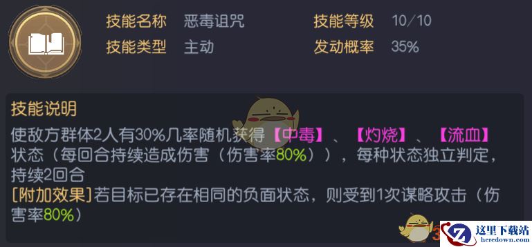 恶毒诅咒35%概率发动看似不高,但是群体2人并且每种状态都会独立判定其实效果非常好,而且已有状态还会进行额外伤害,简直是这个输出思路中的完美技能。