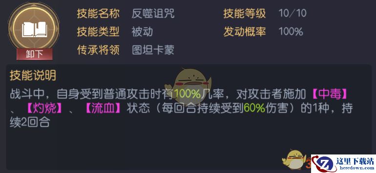 传承技能反噬诅咒也是相当出色的,升到满级以后只要敌人攻击你就会直接被上DEBUFF,没有例外,即使被驱散下个回合一样会中招。