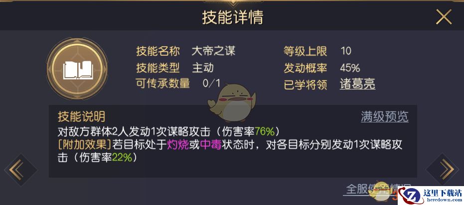 在准备搭配负面状态为主的输出阵容的时候,玩家需要考虑具体想要怎么战斗,主要在两个方向上进行思考,一是与普通的谋略输出队伍一样,通过DEBUFF的辅助来实现超高的伤害爆发,这是能够做到的,因为游戏中许多谋略输出技能都有针对DEBUFF的额外伤害机制或者增伤机制,比如大帝之谋,针对处于灼烧或者中毒状态的敌人会有额外的谋略伤害。