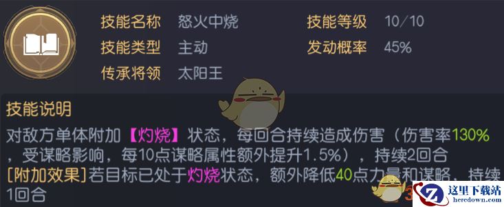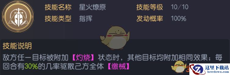 这个阵容是比较典型的DEBUFF输出搭配控制的阵容,太阳王星火燎原的指挥技能可以直接把燃烧铺到敌人全体的身上,配合怒火中烧的效果既能够打出伤害也能够起到降低敌人力量、谋略属性的辅助效果,可以说是攻守兼备的技能组合。而技高一筹则是进一步地提高了己方的输出,附加给敌人的炸营特效也可以起到增伤的作用,在这个阵容里就是一个出色的辅助+输出的角色。