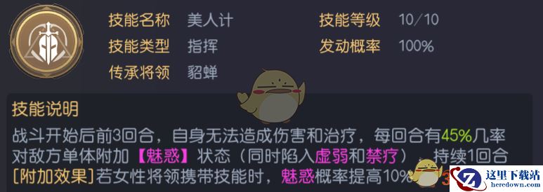 另一方面埃及艳后则是完美起到了控制的作用,本身是女性施展美人计在前三回合都有55%的概率使敌人陷入魅惑,虚弱又禁疗,基本处于被动挨打的状态,美人计效果结束以后她还能够进行主动技能的蛊惑人心和治疗,多面全能。