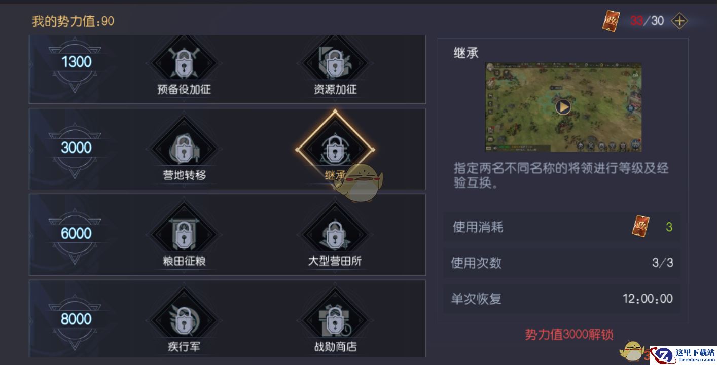 同时每一次“继承”只需花费3个政令即可,十分亲民。