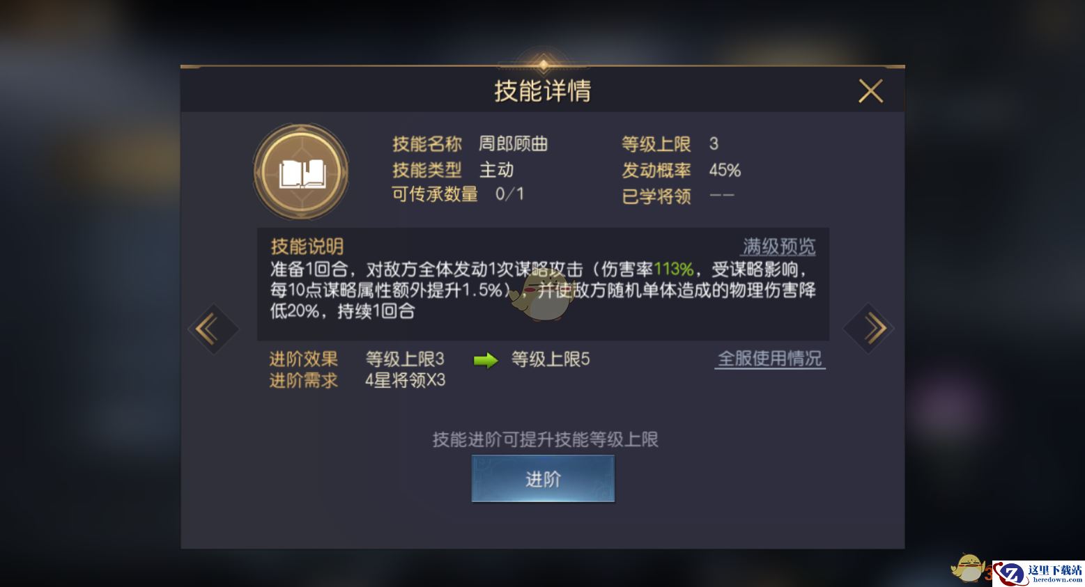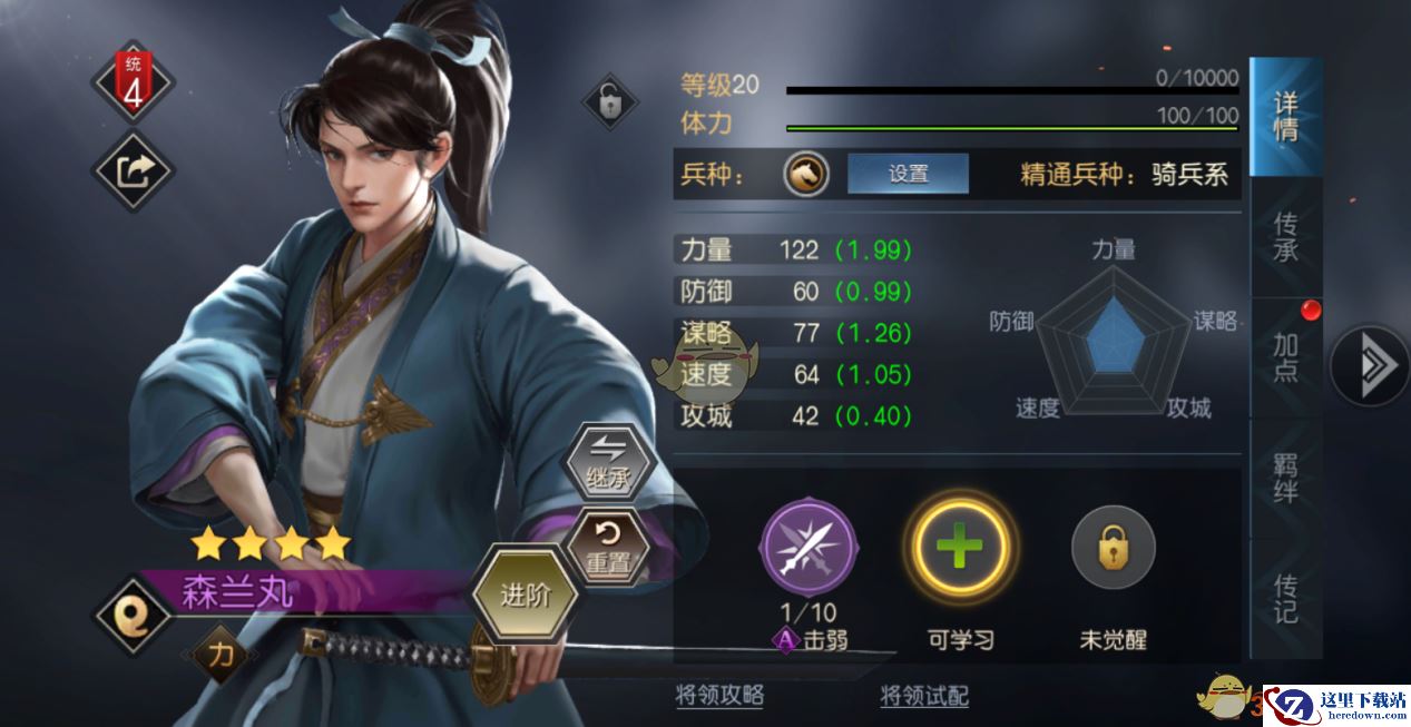 但在《征服与霸业》中无论是几星将,只要点了传承即可解锁并使用技能,S级技能也一样,只需后续用四星将提升等级上限即可,这也是《征服与霸业》独有的特点之一。