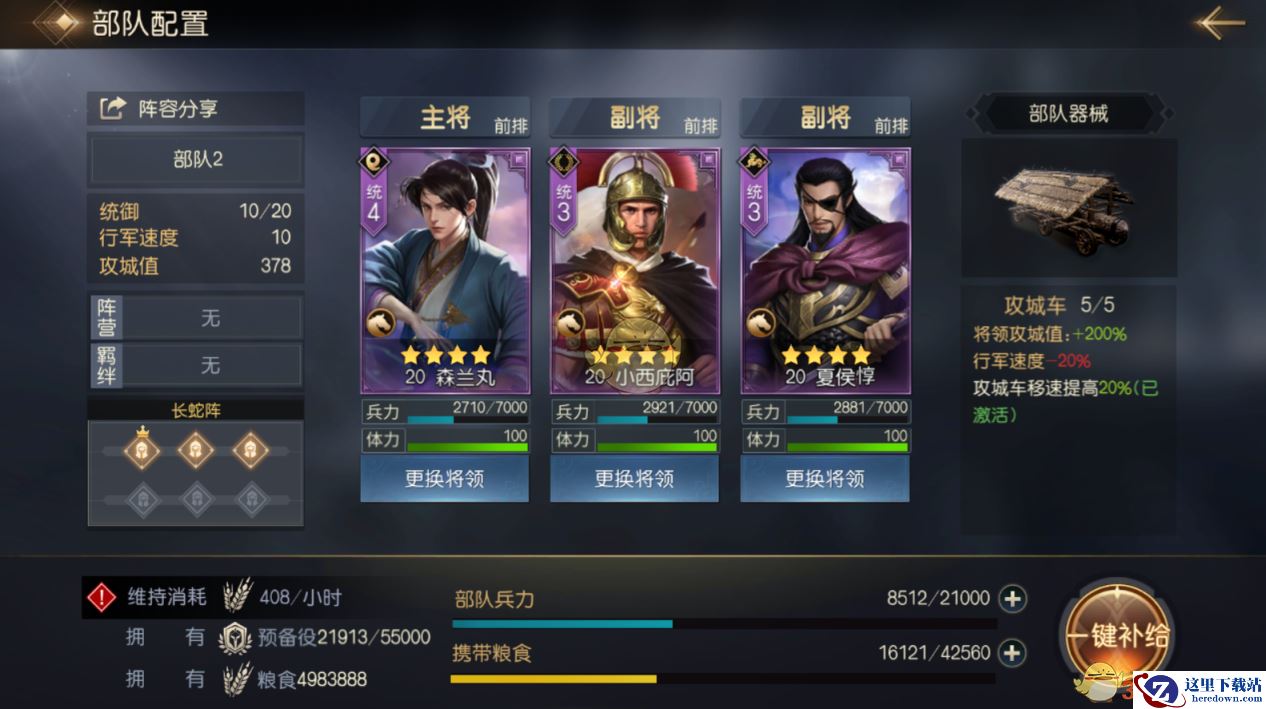 需要注意的是,《征服与霸业》中武将的攻城值是按照星级顺序来的,因此为了保证武将的基础攻城值,在性价比方面由四星的武将来构成拆迁队最佳,同时攻城值也需要一定的等级来支撑,因此拆迁队的武将最好维持在20-30级左右最佳。