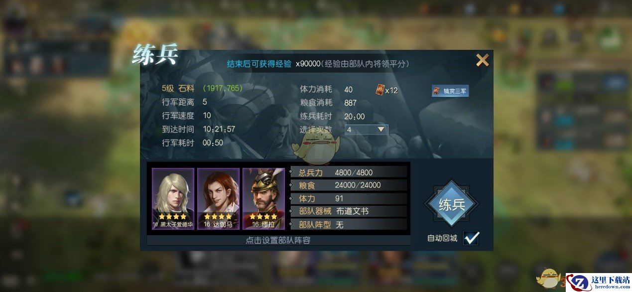 练兵不需要消耗任何兵力,1级将领也能直接到5级地练兵。玩家每天能从联盟处获得10点额外政令,正好可以用在别动队的练兵上。4次练兵给90000经验,足够把15级左右的别动队提升到20级,直接拉到主队的水平。