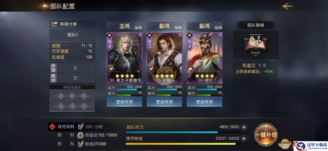 2. 新手期间反还所有技能点,而初期我们的技能点是点不满2队将领6个技能的。所以在第二天开猛开5、6级地之后,如果主队的体力耗完,而你还有预备役剩余,可以把技能卸下来给别动队,只要别动队的将领不是弱得离谱,那么配合打杂队,拿下5级地是没有问题的。