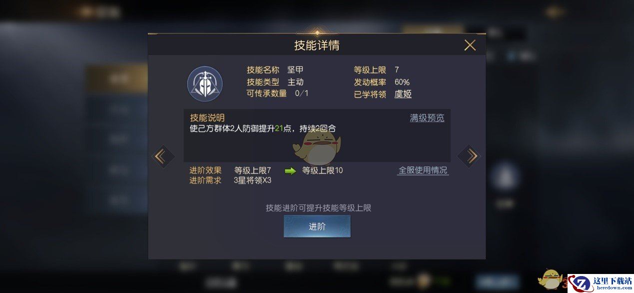 山本勘助的坚甲则是相对好用的防御技能,60%的触发率给到2人群体防御,适合给主力队除了项羽虞姬的第3位将领带,或者直接给虞姬带,提高一下夫妻俩办事的持久力。美中不足的是技能成长上限很低,最多只能给2人30点防御,持续2回合buff。但相比之下还是比挫折这种针对性辅助技能好用很多。